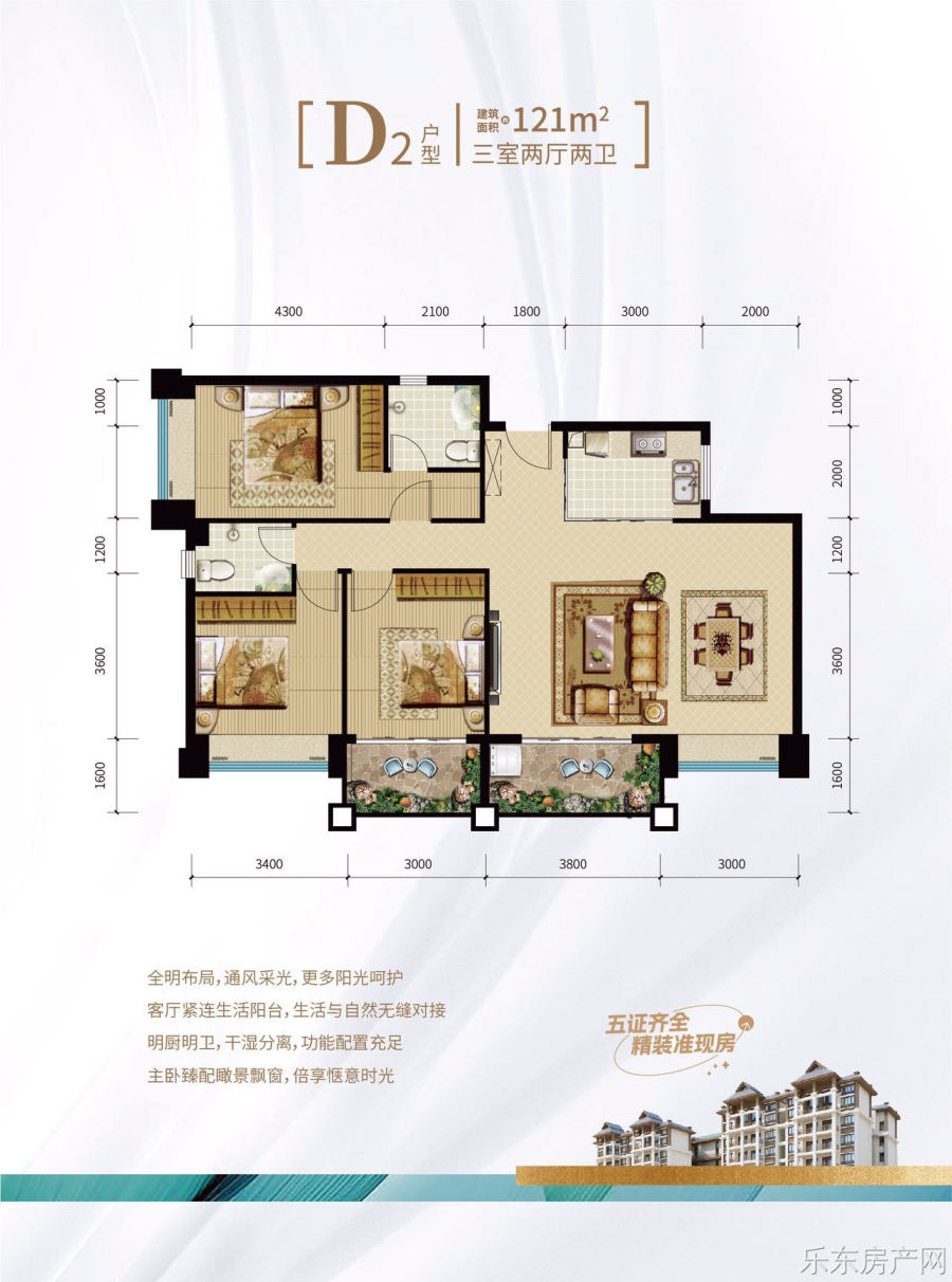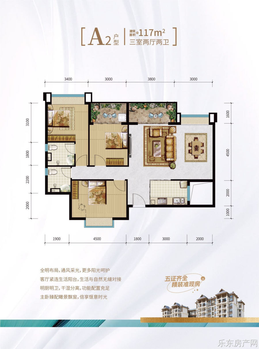 在售户型:107.44㎡、117.17㎡、117.96㎡、121.03㎡(均为3房2卫户型)